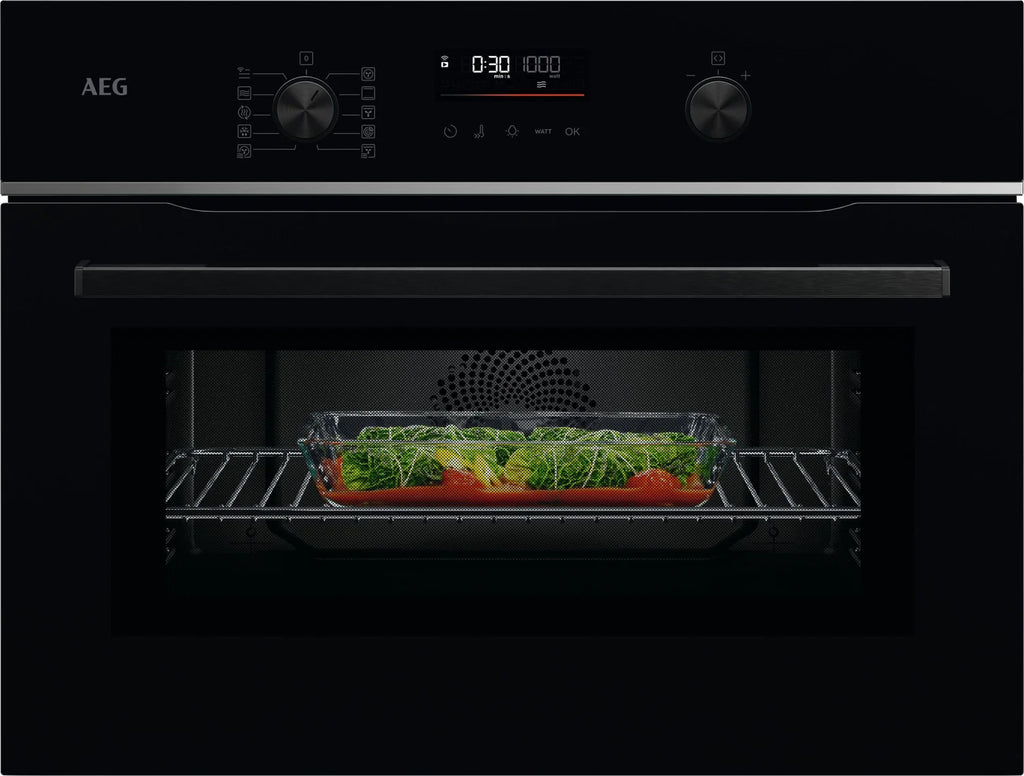 AEG Connected CombiQuick Compact Combination Oven - Gloss Black With Steel Infinity Strip