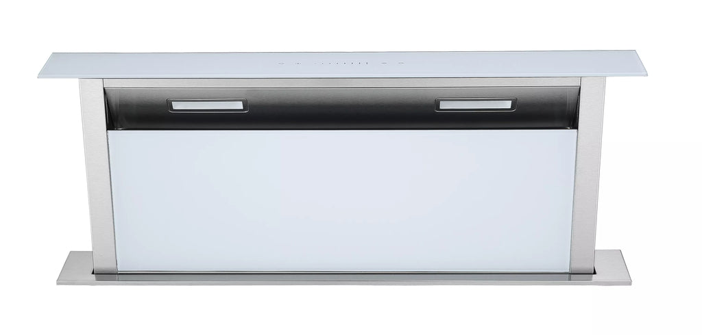 Perfect for modern open-plan kitchens, this white glass and stainless steel downdraft cooker hood offers a stylish, functional, and space-saving solution for efficient kitchen ventilation.