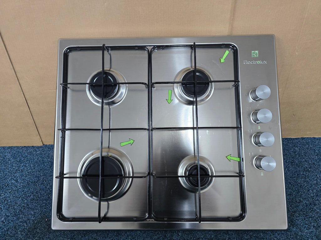 This graded Electrolux KGS6404SX 60cm 4 Burner Gas Hob is an ex-display product with blemishing to the hob surface. Please see images as an example.