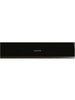 This warming drawer features a black glass and stainless steel finish, 25kg capacity, holds 16 plates, and includes defrost and dough proving functions with adjustable temperature and air vented circulation.
